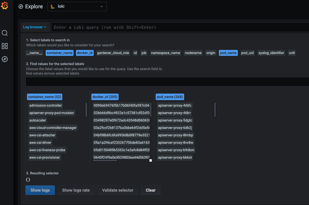 If you click on the Log browser > button, you will see all of the available labels. Clicking on the label, you can see all of its available values for the given period of time you have specified. If you are searching for logs for the past one hour, do not expect to see labels or values for which there were no logs for that period of time. By clicking on a value, Plutono automatically eliminates all other labels and/or values with which no valid log stream can be made. After choosing the right labels and their values, click on the Show logs button. This will build Log query and execute it. This approach is convenient when you don't know the label names or their values.