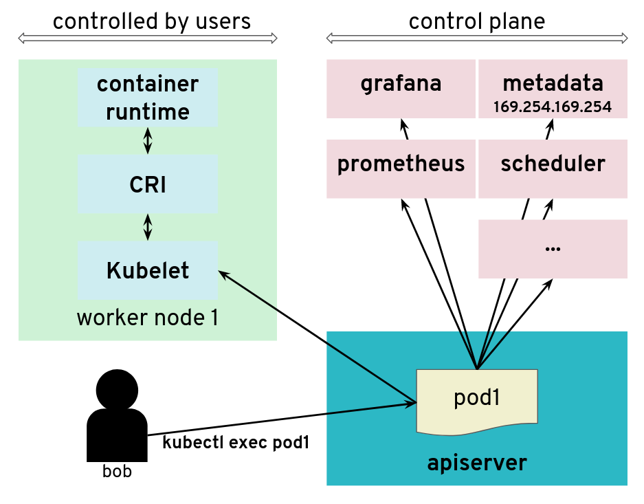 In contrast, users (even those with “system:masters” permissions or “root” rights) are often not given access to the control plane. On setups like, for example, GKE or Gardener, the control plane is running on separate nodes, with a different administrative access. It could be hosted on a different cloud provider account. So users are not free to explore the internal networking the control plane.