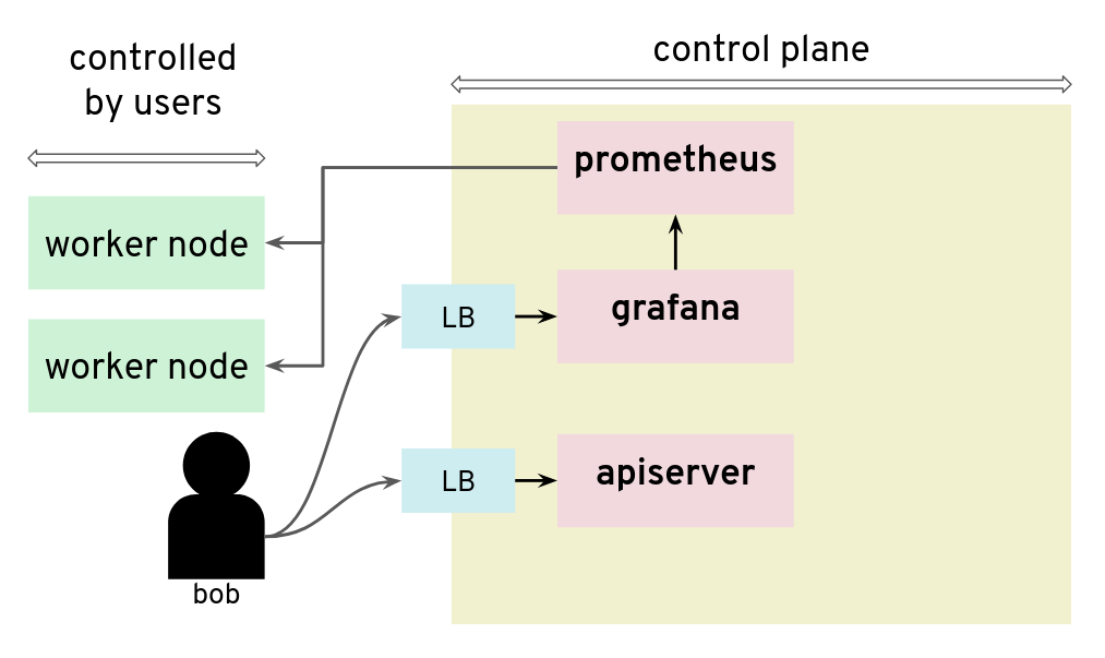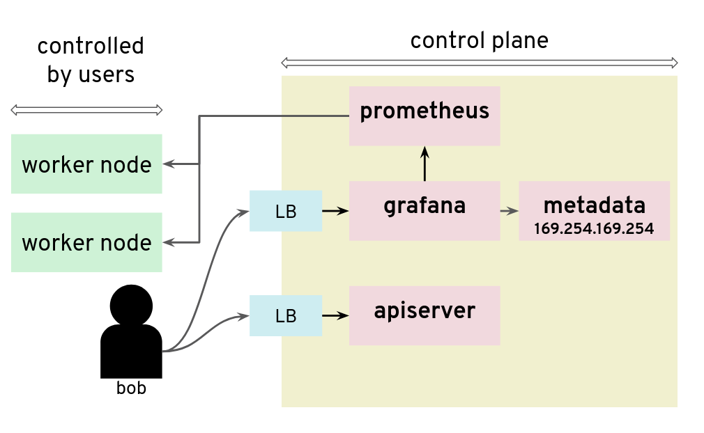 For our tests, we had access to a Kubernetes setup where users are not only given access to the API server in the control plane, but also to a Grafana instance that is used to gather data from their Kubernetes clusters via Prometheus. The control plane is managed and users don’t have access to the nodes that it runs. They can only access the API server and Grafana via a load balancer. The internal network of the control plane is therefore hidden to users.